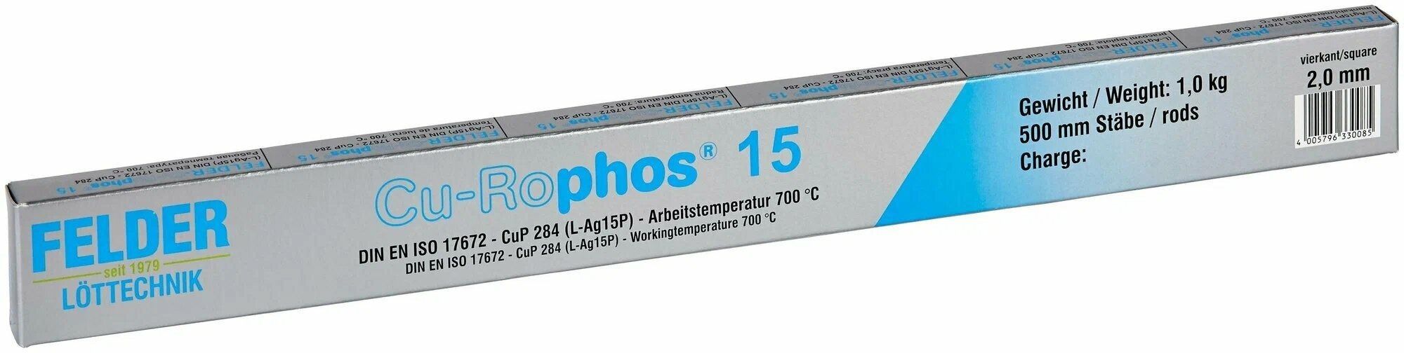 Назначением медного припоя Felder "Cu-Rophos15" L-Ag15P с 15% содержанием серебра является пайка меди и сплавов на ее основе, латуни, мельхиора и бронзы.